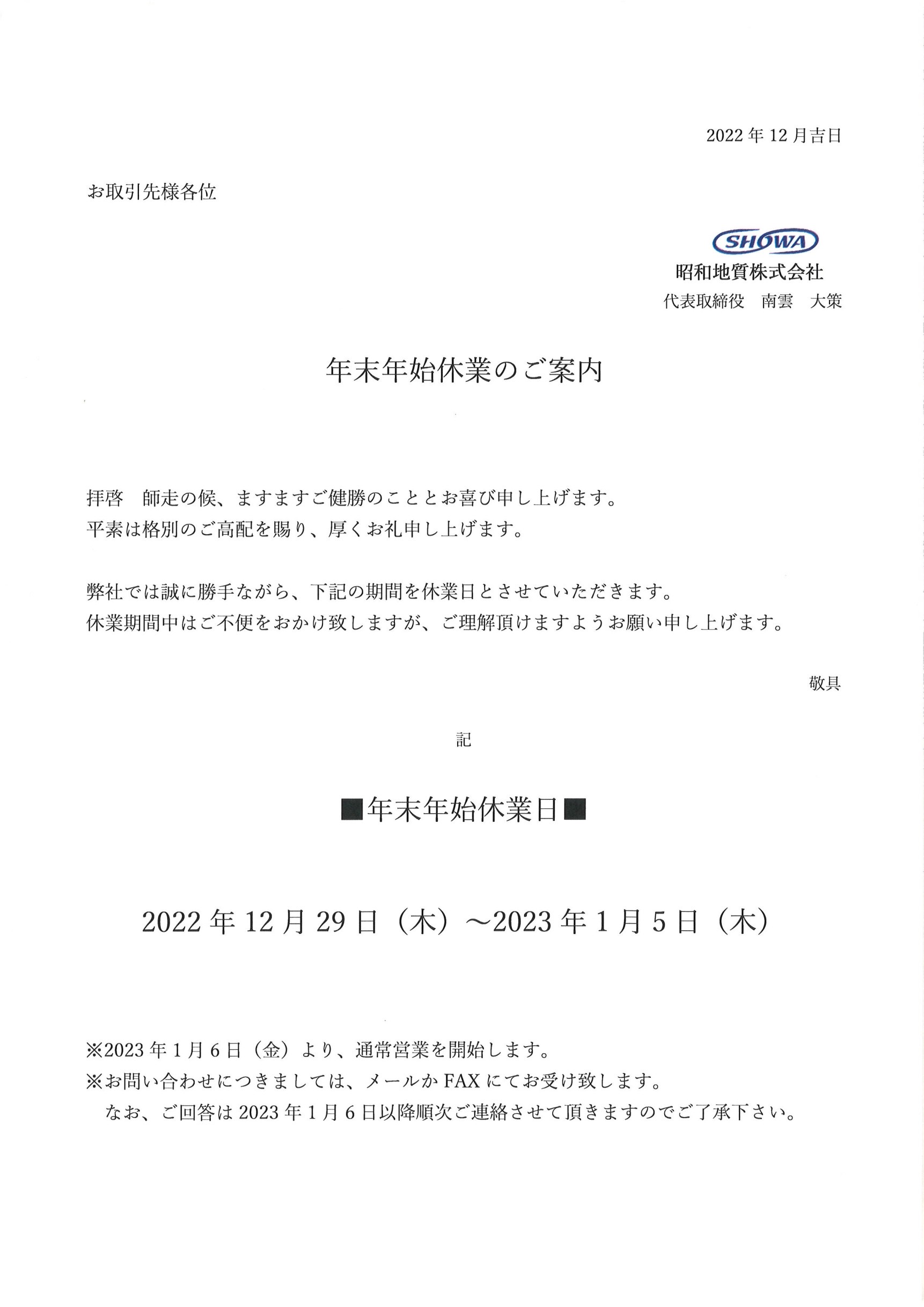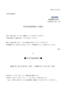 年末年始休業のご案内