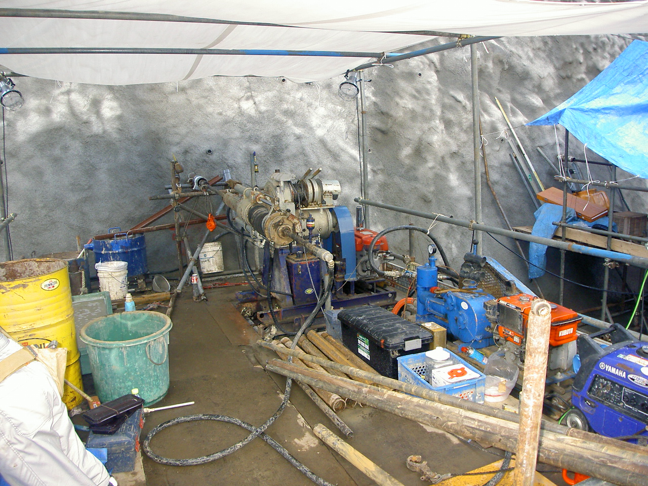 ボーリングマシンを地面と水平にセットすることにより、山の斜面に孔(あな)を開けて調査をしました。